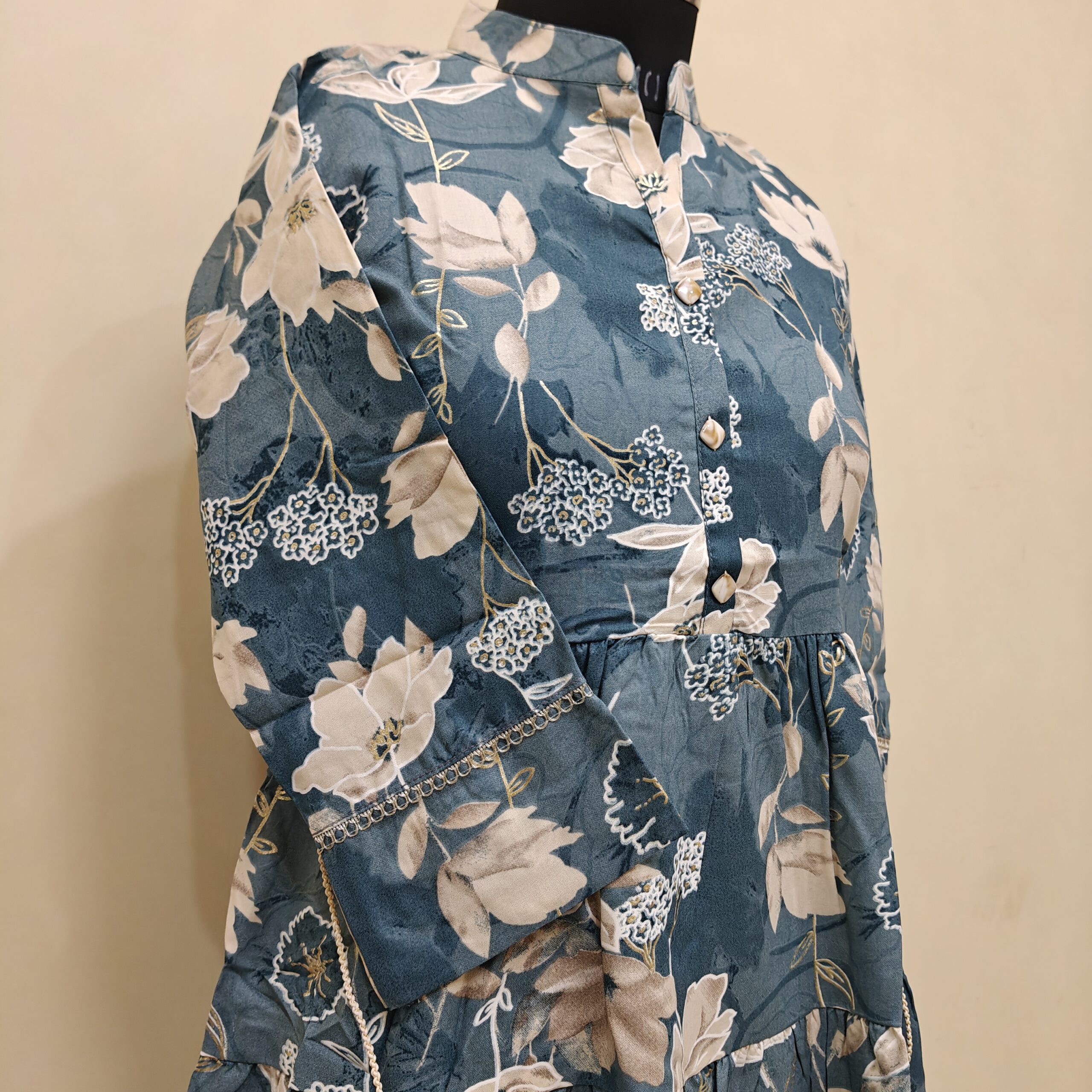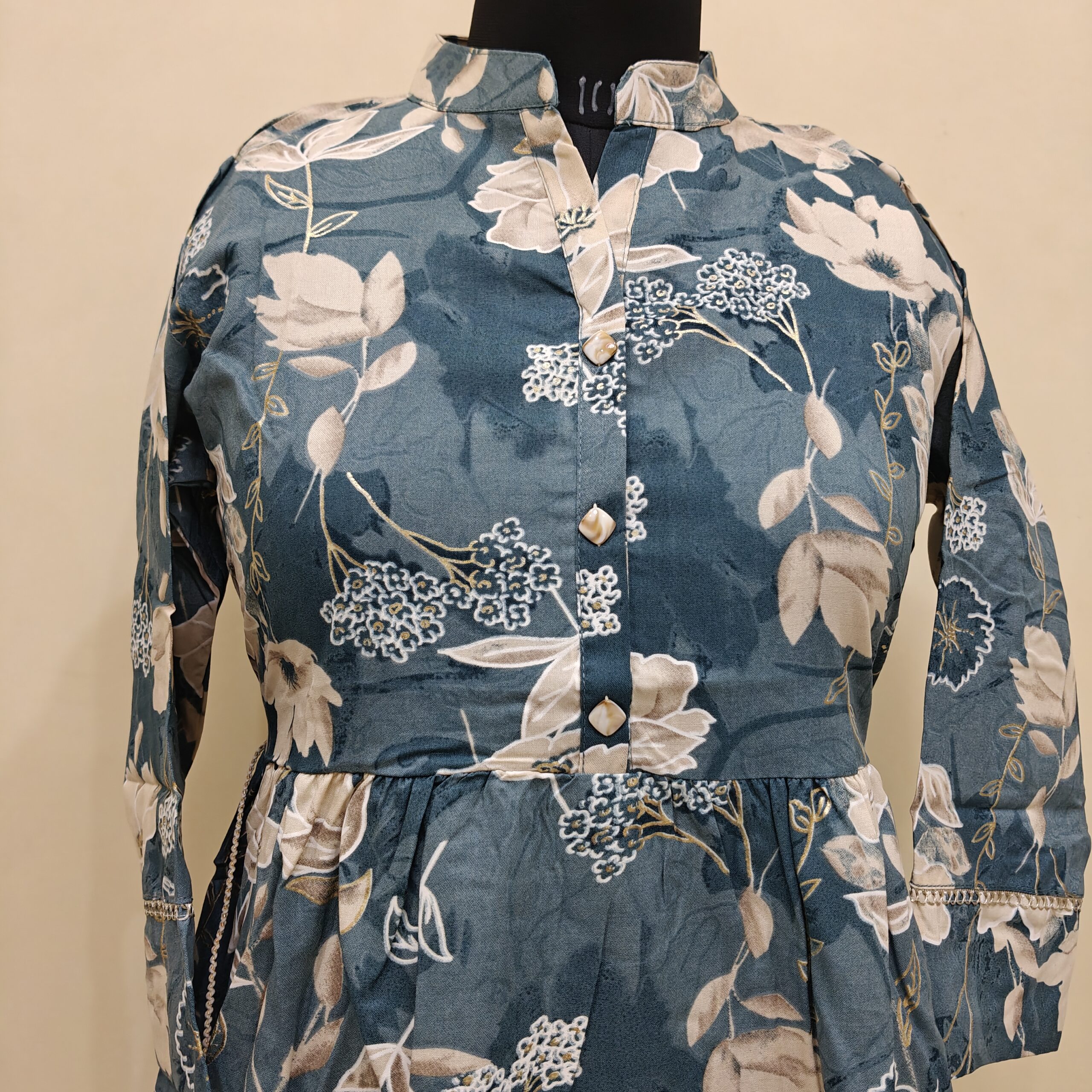 Floral short kurta, combined with 3/4th sleeves and a chic band stand-patti. The design makes it a versatile addition to your everyday collection.